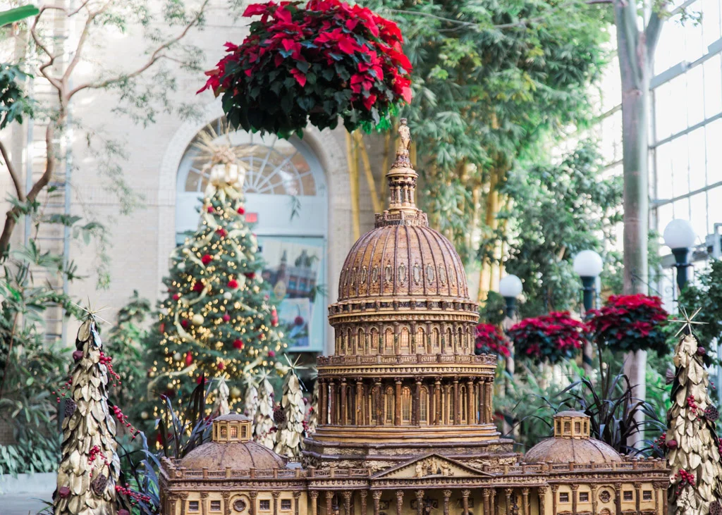 The U.S. Botanic Garden’s festive Christmas display including a model of the Capitol with poinsettias, Christmas floral decorations, and a Christmas tree.