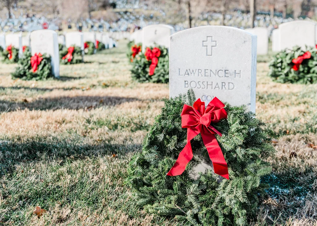 Christmas wreaths laid on the headstones at Arlington National Cemetery.