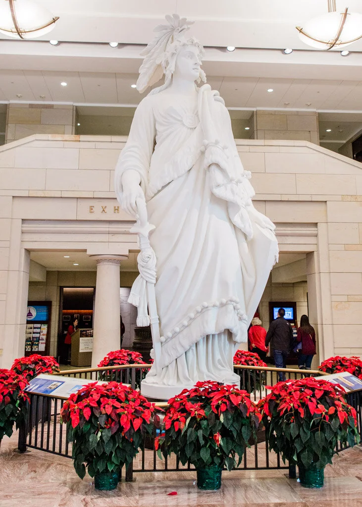 White replica of the Statue of Freedom that sits atop the Capitol dome surrounded by poinsettia plants in the interior of the Capitol building.