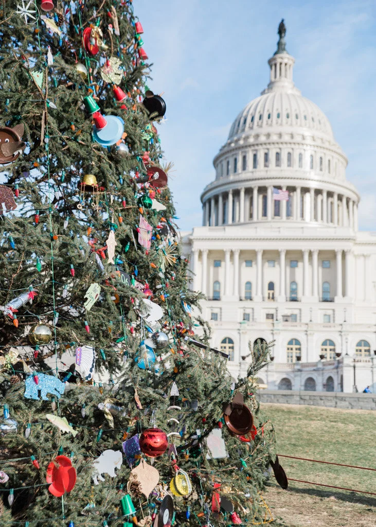 Close up of Christmas tree with homemade decorations by children with the Capitol building behind it in Washington D.C.