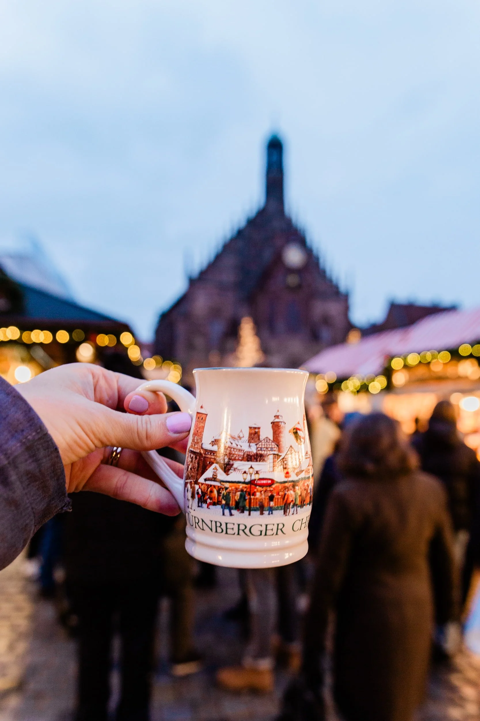 Here’s how it usually works. When you purchase a hot drink, it will come in a ceramic mug decorated uniquely for that city/market. When you look at the menu, you’ll see the price for the drink (3€) and you’ll also be charged a pfand (deposit) of anywhere from 3-5€. So the total for you drink will be somewhere around 6-10€. If you return the mug to the stand, you’ll get the pfand back. But if you want to keep the mug, you can.