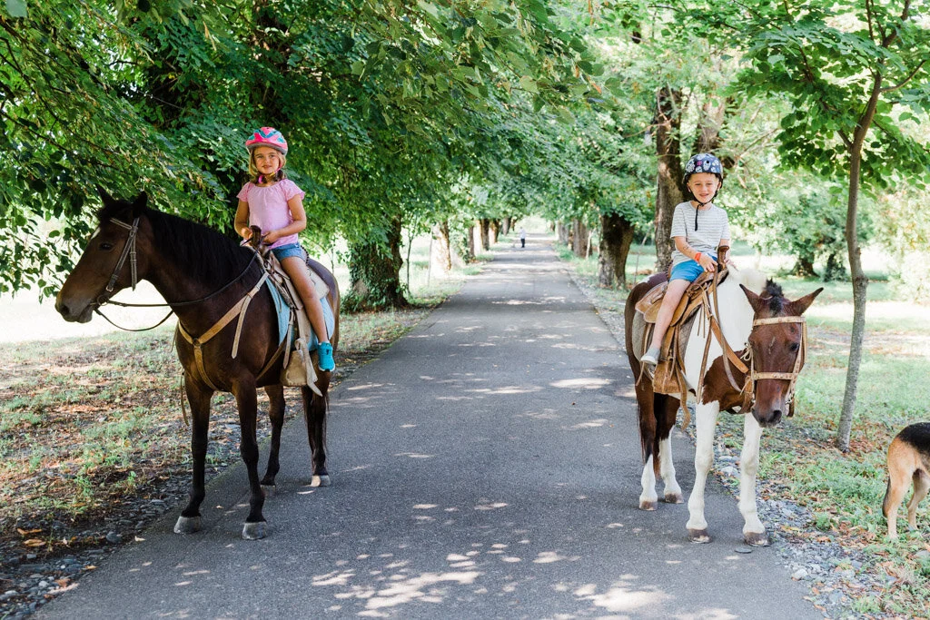 Kids having fun going for a horseback ride at Lopota Lake.